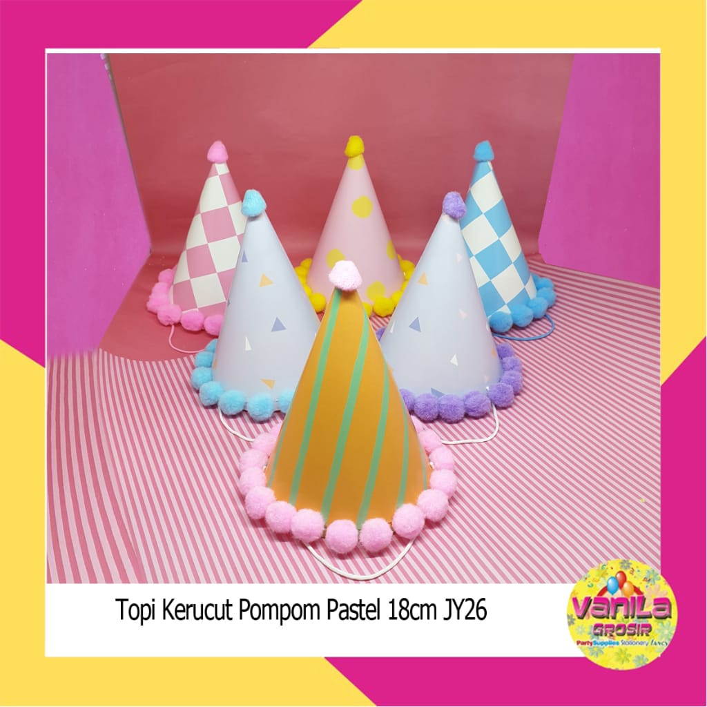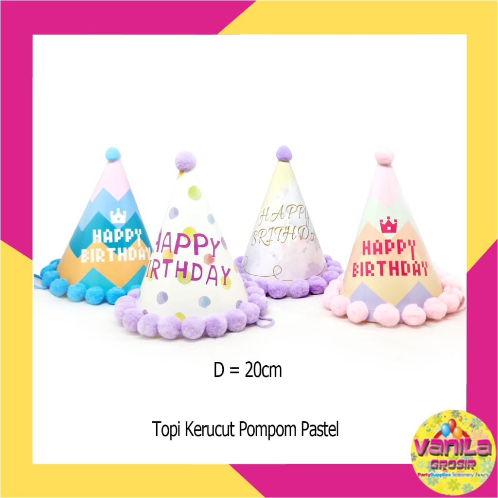 Topi Kerucut Pompom Pastel Happy Birthday